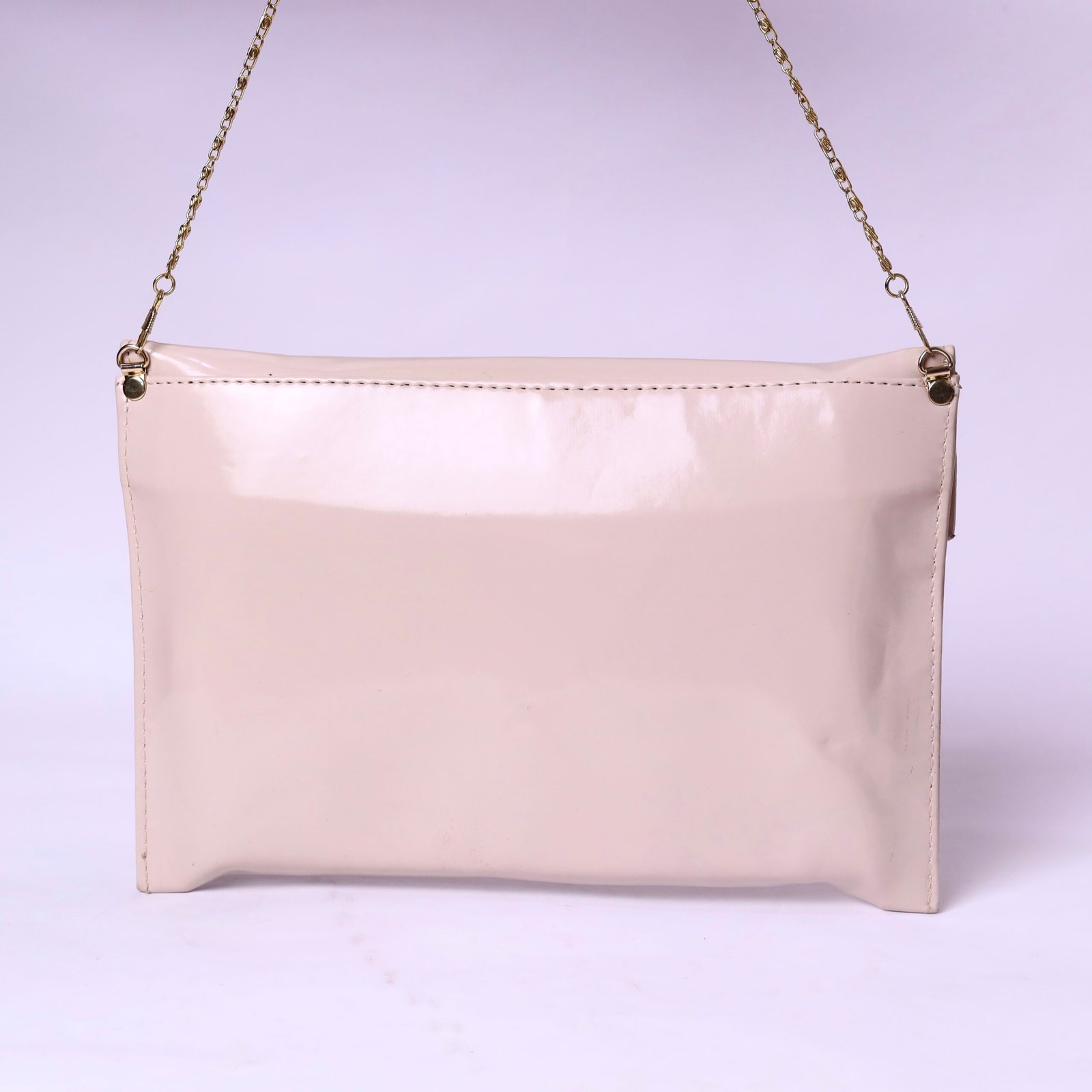 | Elegant beige envelope clutch featuring a sleek minimalist design and gold-tone triangle hardware. Designed with a detachable chain strap, it can be worn over the shoulder or carried as a classic clutch. Perfect for formal events, dinners, and special occasions, adding a refined and sophisticated touch to any outfit. |
