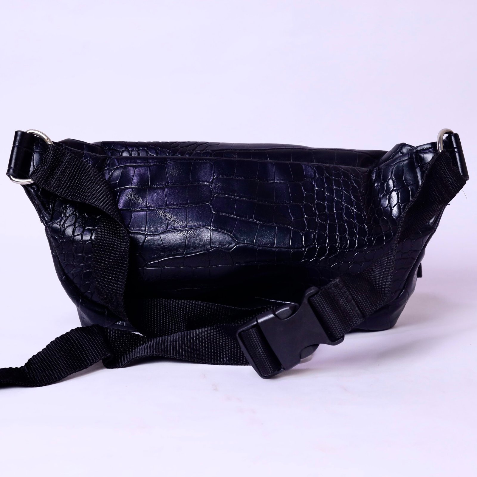 | stylish black belt bag featuring a croc-embossed texture for a bold, modern look. Designed with a secure zip closure and adjustable strap, it can be worn around the waist or crossbody for versatile everyday styling. Compact yet practical, perfect for carrying essentials while keeping your hands free. |