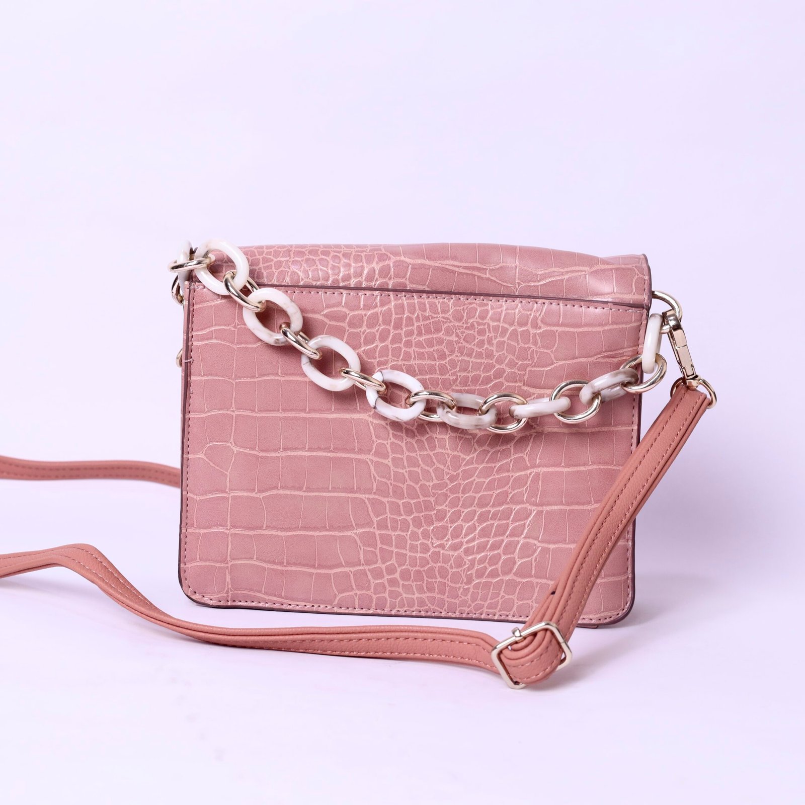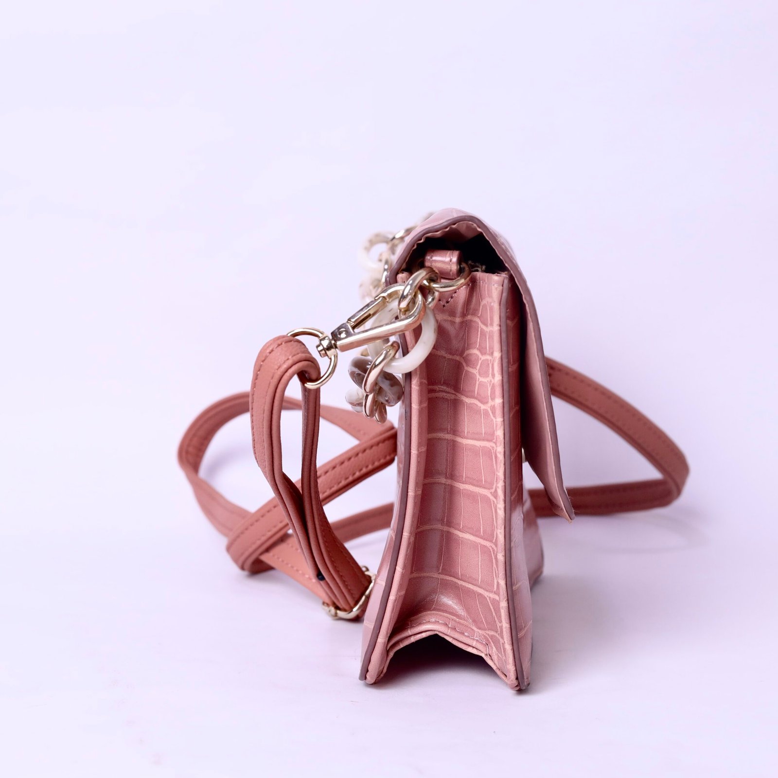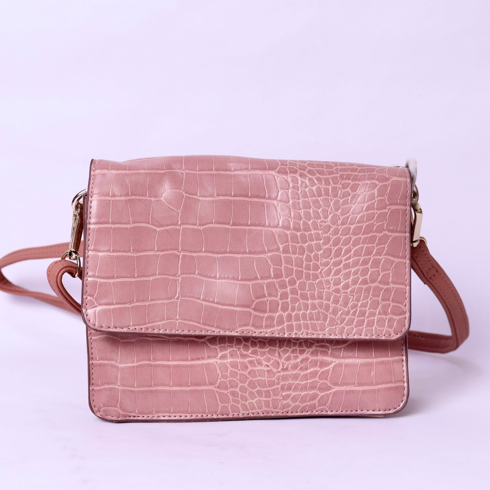 | A chic blush pink crossbody bag featuring a croc-embossed texture for a refined, modern look. Designed with a structured silhouette and adjustable strap, it’s perfect for everyday wear or casual outings. Compact yet practical for carrying your essentials in style. |