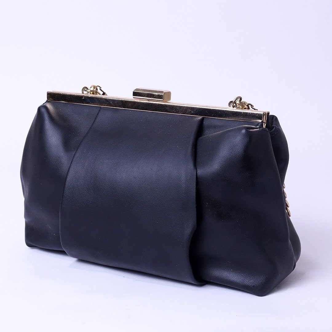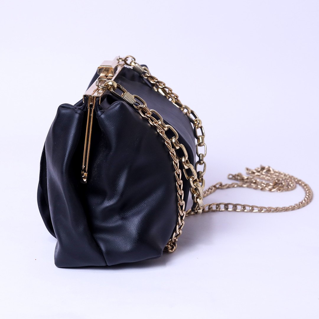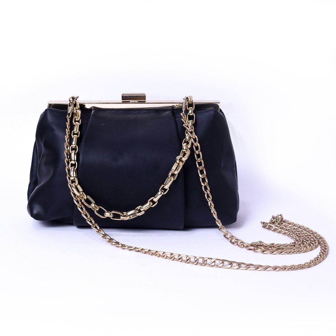 A chic and elegant evening clutch designed with a soft structured body and a sleek metal frame closure. Features a gold-tone chain strap that can be worn over the shoulder or carried as a clutch for versatile styling. Perfect for evening events, parties, and special occasions, adding a refined and stylish touch to any outfit. Combines modern elegance with practical compact design.