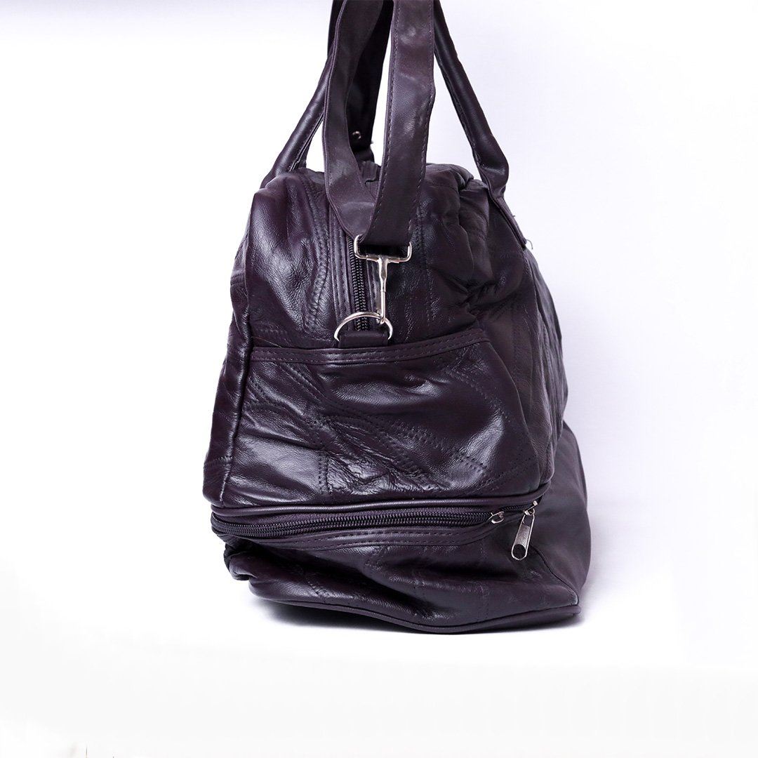 Spacious dark brown leather travel bag with a soft structure and sturdy handles. Ideal for short trips and everyday carry.