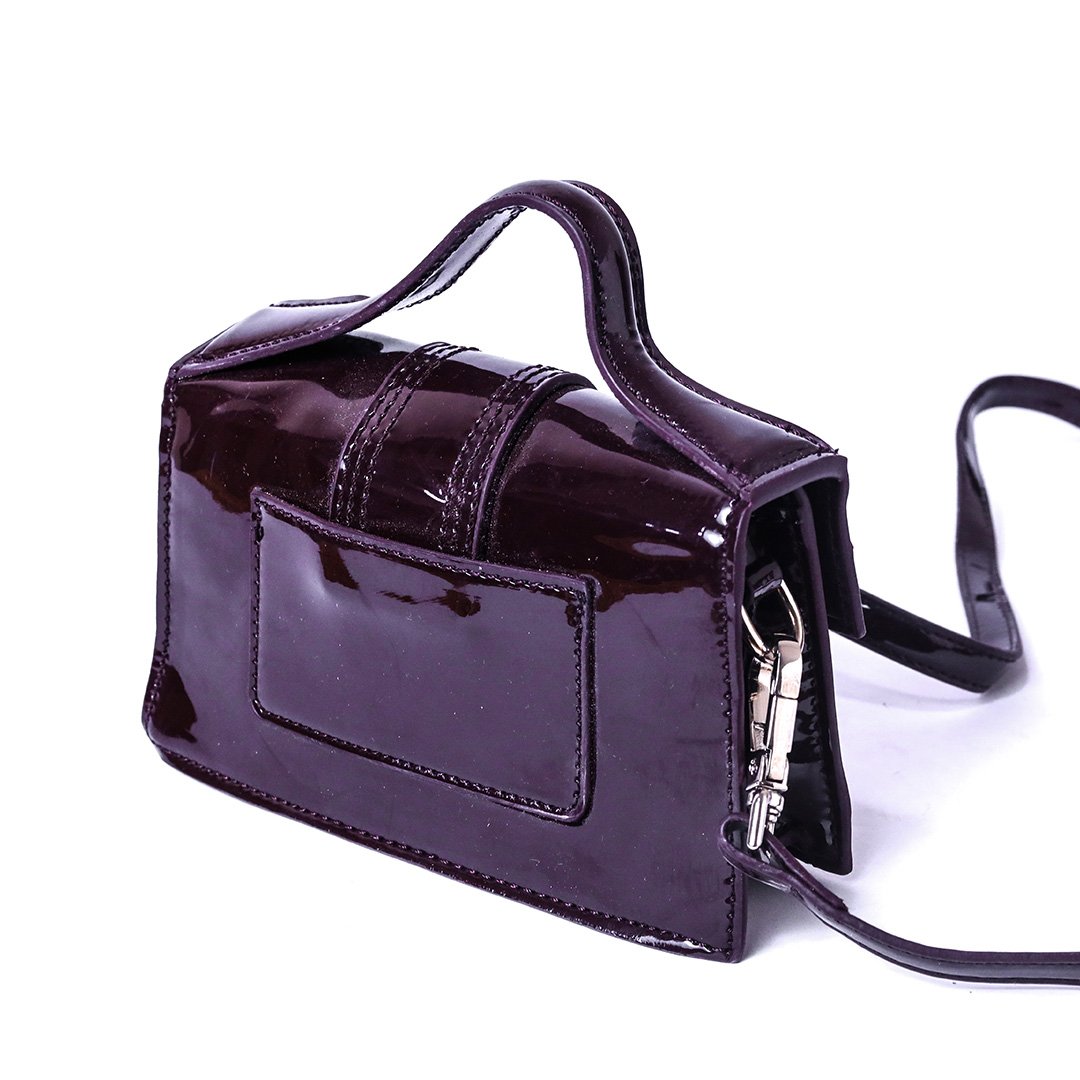 Stylish mini crossbody bag with a glossy patent finish.