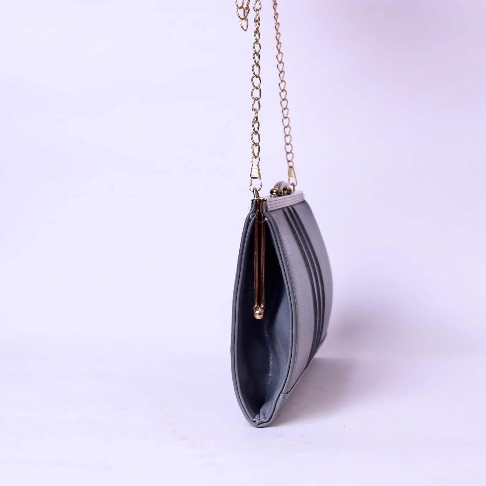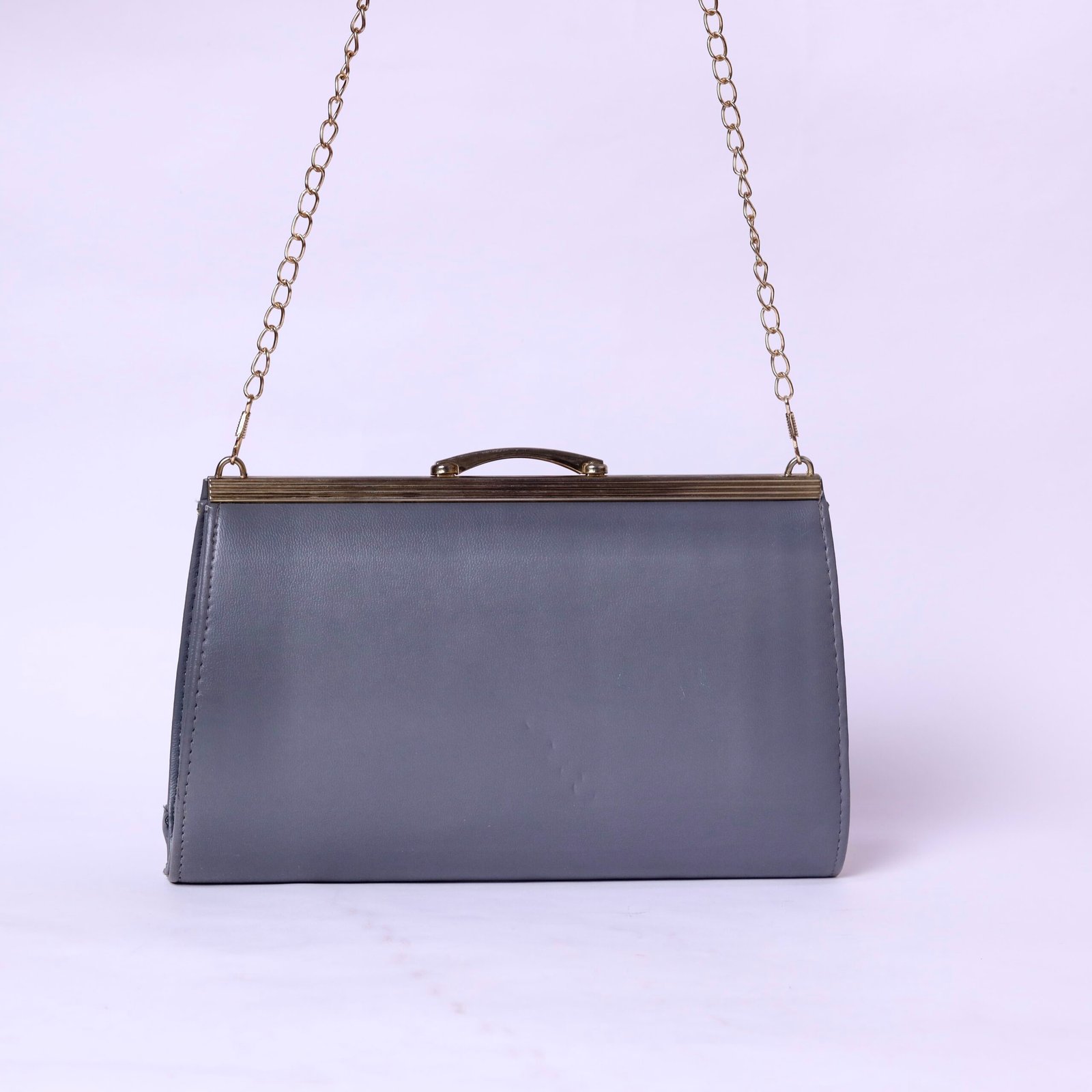 | Elegant grey structured evening bag featuring a classic metal frame closure and gold chain strap. Designed with a clean, minimal silhouette, it’s perfect for formal events, dinners, and special occasions. Compact yet functional, it fits your essentials while adding a refined touch to any outfit. |