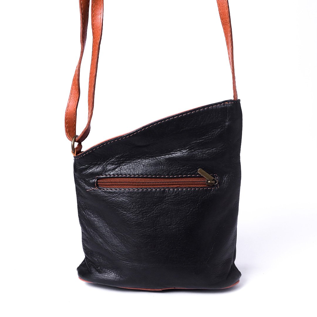 Soft leather crossbody bag with a black exterior and tan details. Lightweight, practical, and perfect for everyday use.